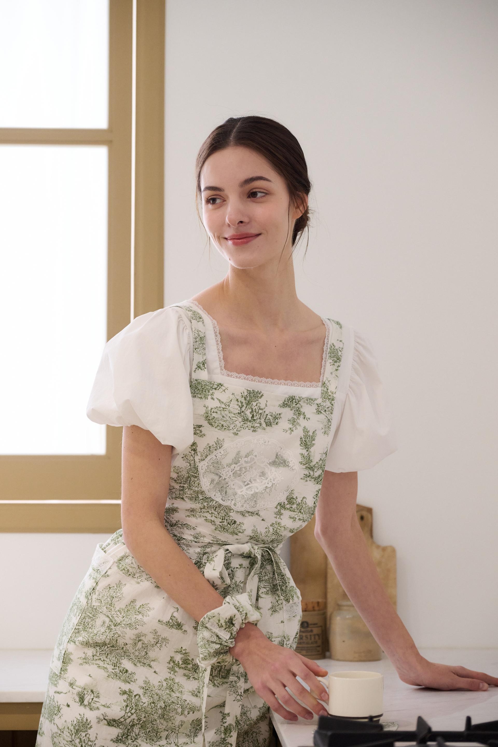 绿色茹伊印花长款荷叶边围裙