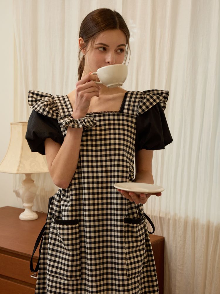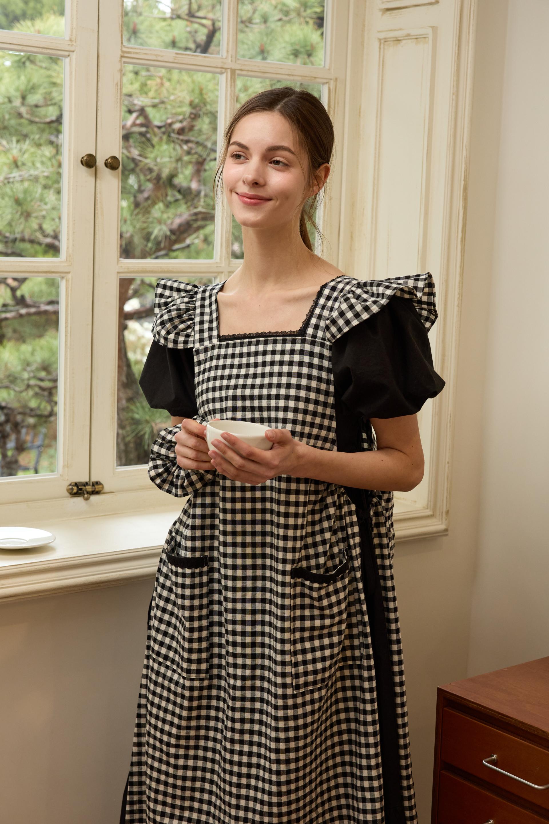 블랙 체크 어깨 프릴 원피스 에이프런